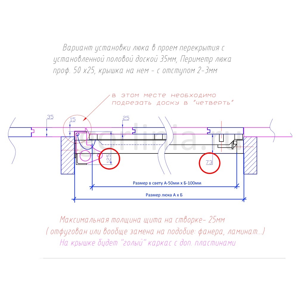 Скрытый короб из профиля 50х25 без наличника крепят в торец плиты (лагу) на расчетную отметку над уровнем чистовых полов. Со стороны оси открывания на паразитку приходит деревянный пол до 35 мм с подрезкой в четверть 15 мм, отступом 4-6 мм от края полки по месту. Дверь обшивается доской 25 мм с запилом торца на угол, как на схеме, для свободного хода двери на газовых амортизаторах до угла распахивания 88° при зазоре 2-4 мм на петлевым узлом.