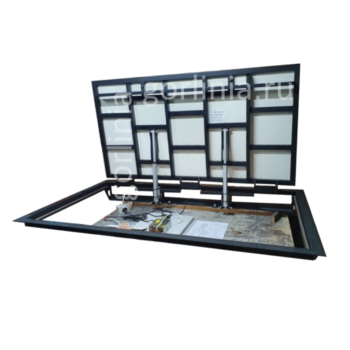 При постановке крышки на стопор в режиме ручного открывания исключить возможность использования привода.Изделие отгружается с установленными подъемниками и соединительными проводами. Актуаторы выставлены соосно и отрегулированы с контрольным пуском инженером по качеству изготовителя. Снизу по стороне шарниров стоит кронштейн на направляющих. Узел выставляется и крепится в торец плиты пола, а также к реактивной планке после установки при поднятой крышке согласно инструкции.