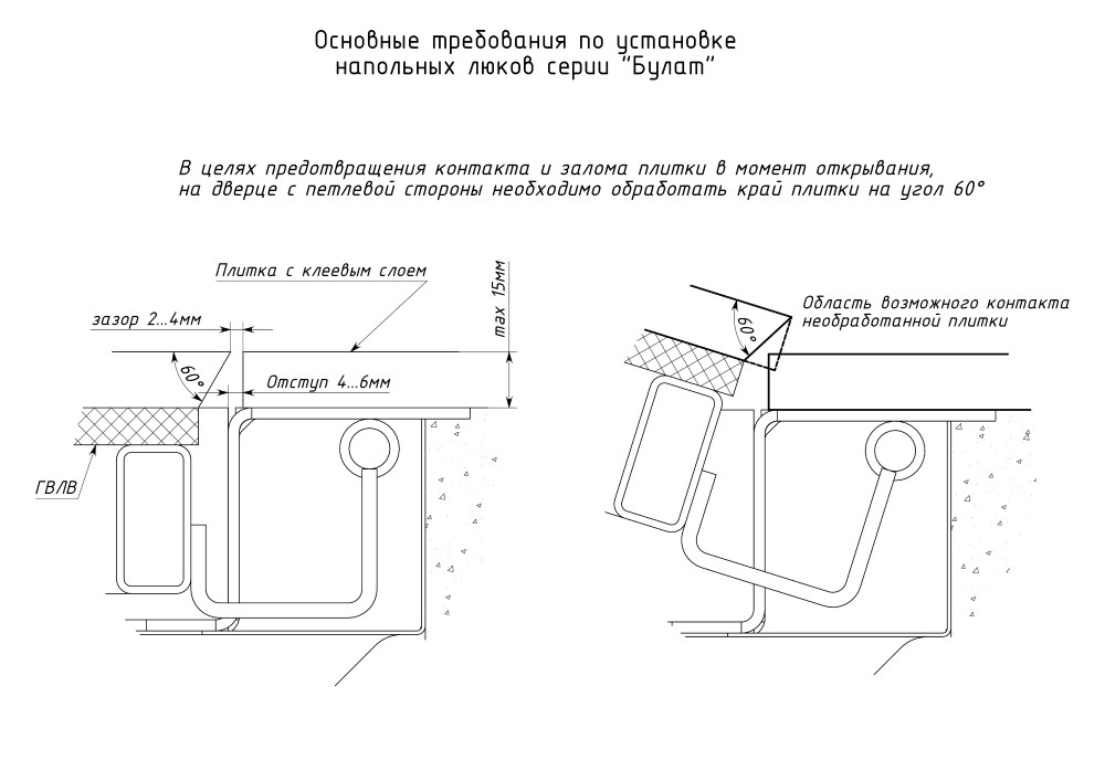 Плотный притвор без щелей в полу со смещенными за ось открывания петлями через вырезанные в раме ниши. Легкая ходовая часть на амортизаторах и удобный монтаж с облицовкой крышки керамическим или ламинированным покрытием.